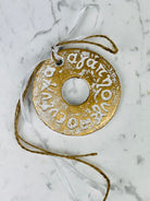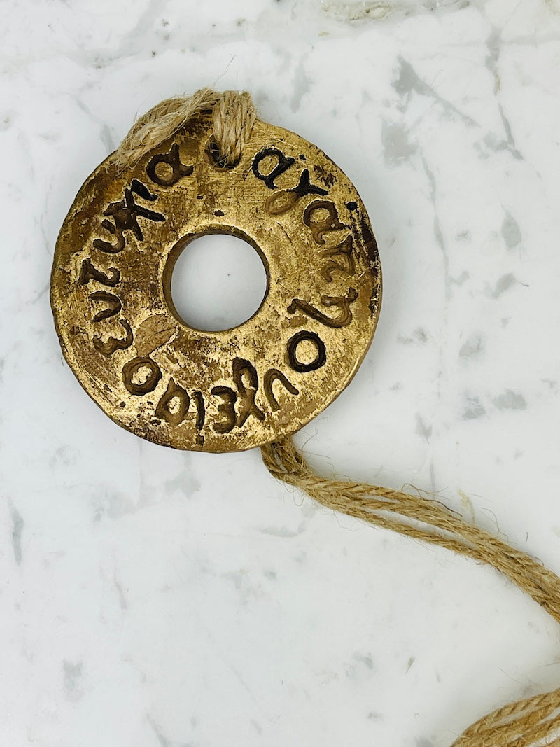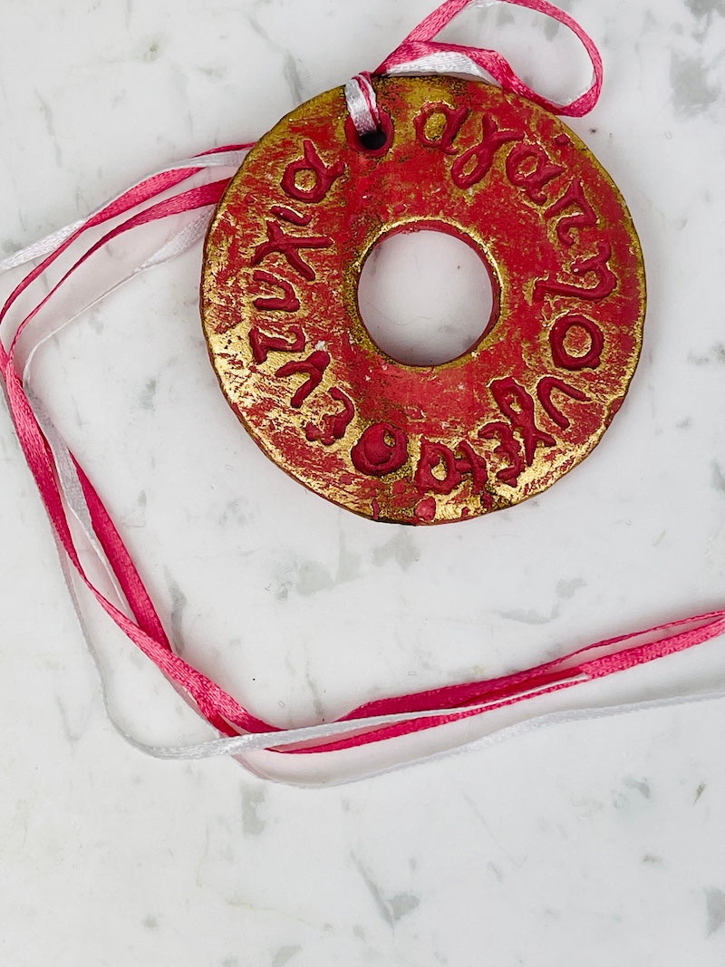 - Written in Greek, this charm translates to: “Love, Health, Happiness”