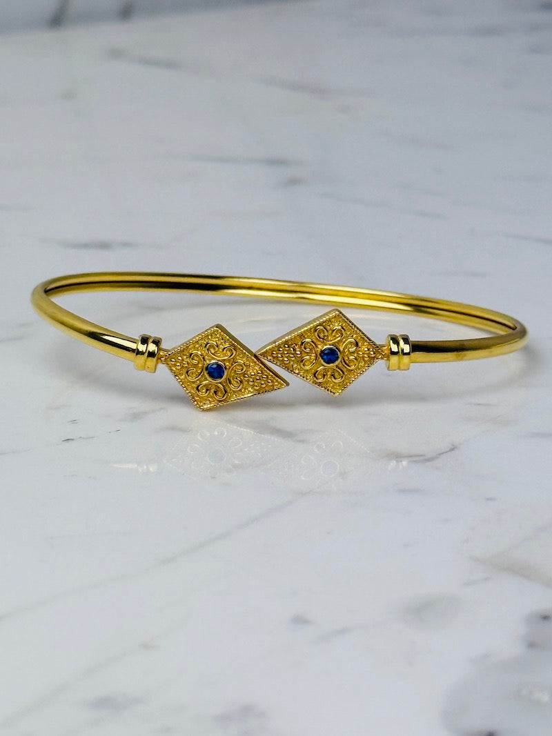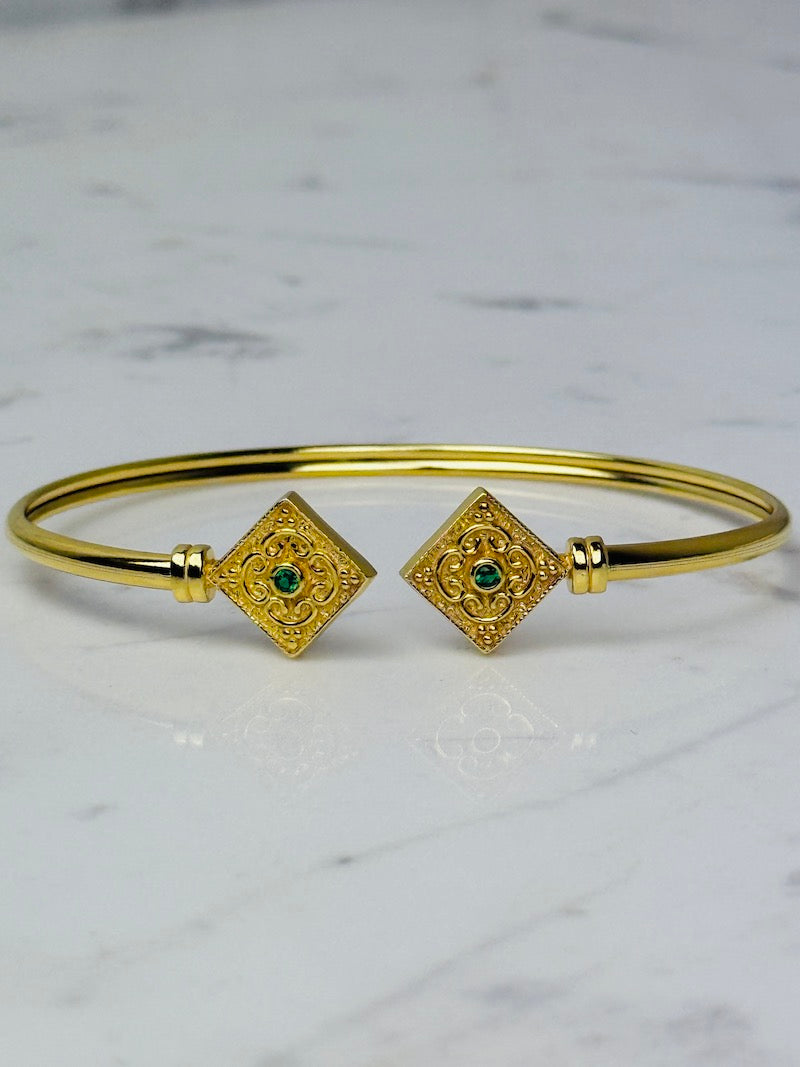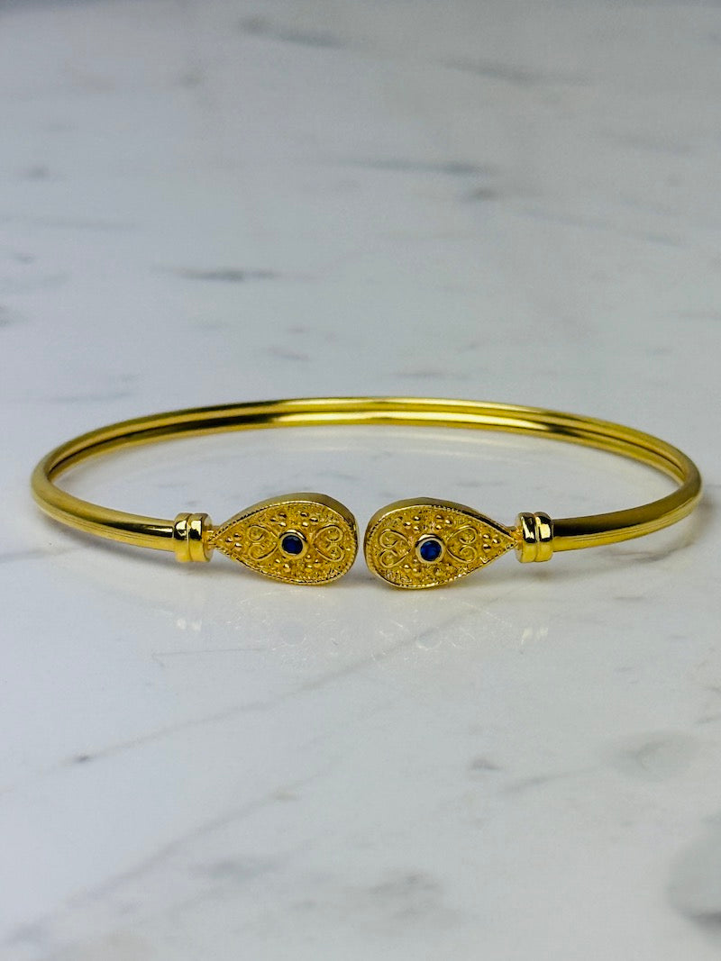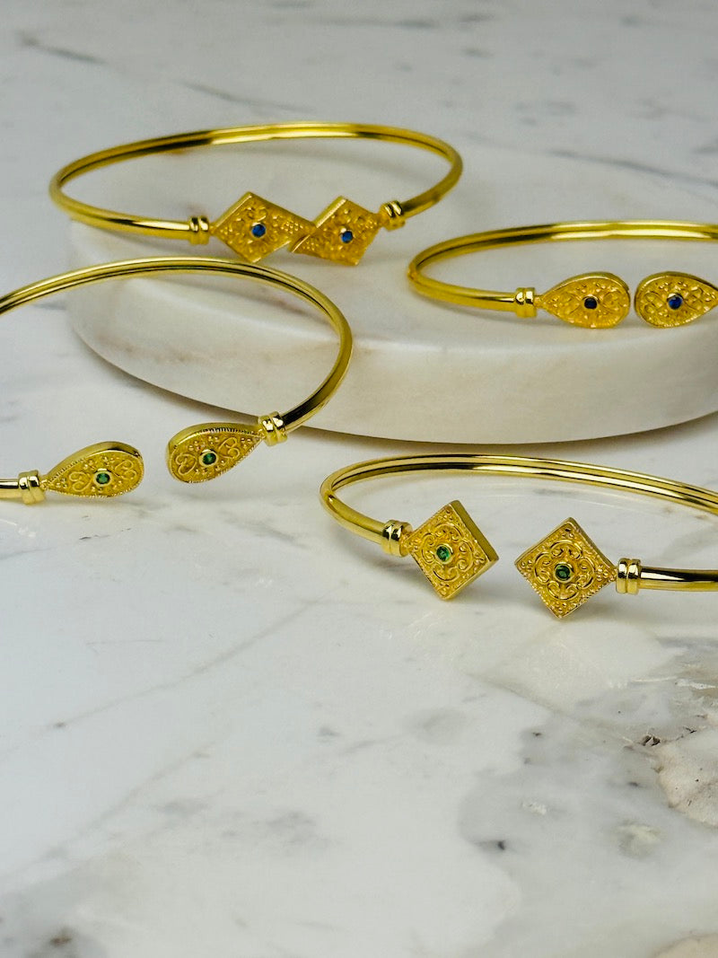 Where old world meets modernity. Modeled after the beautiful golf foil and intricate designs of Byzantine art, these bangles will elevate any outfit.