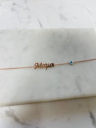 • 7/8″ charm with small evil eye bead on 8″ chain
