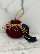 - Accented with tassel, ribbons and horseshoe charm