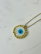 - 1″ painted glass evil eye medallion with gold hematite accents